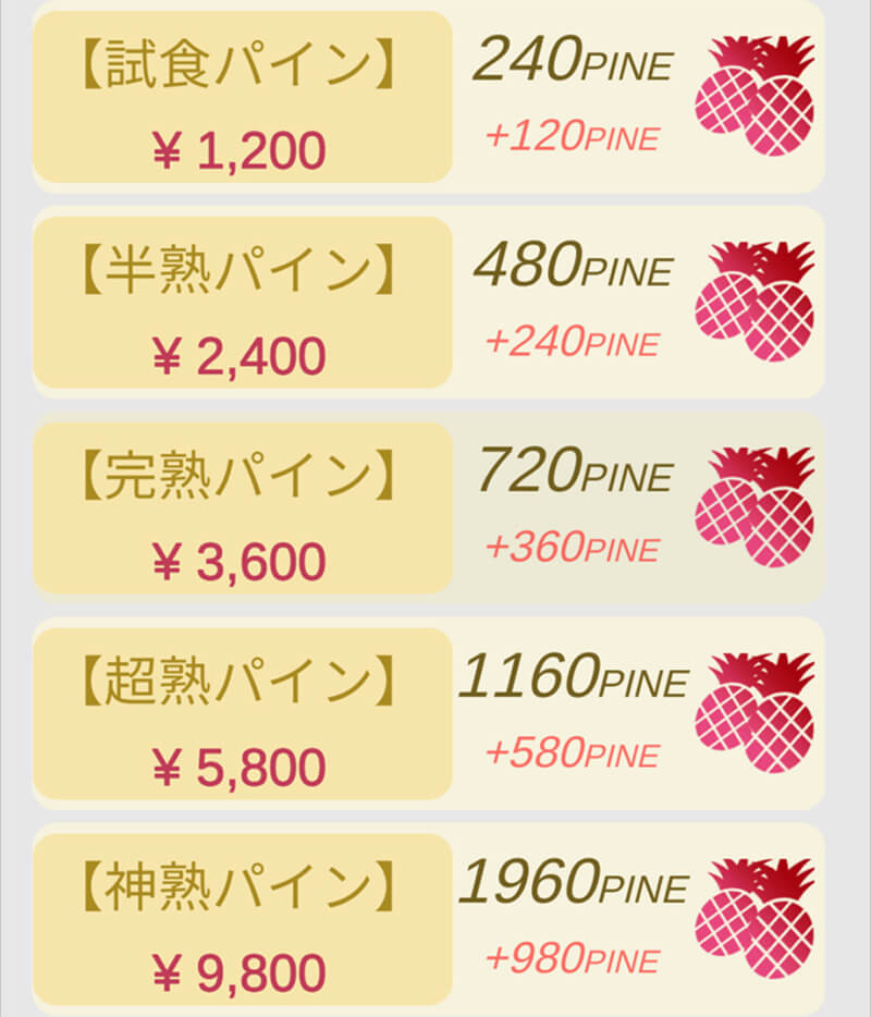 「完熟パイン」は、PINE消費制で、基本のレートは1PINE=10円です。購入プランを見てみると、現在はキャンペーン中なのか倍のPINEが付与されるためお得ですね。